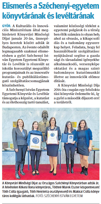 Kitüntették a győri Széchenyi-egyetem könyvtárát